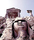 伊豆七島の新島はサーフィンのメッカ。首都圏のサーフィンに人気の新島。小島が地続きになる浜では海水浴&シュノーケリング。ギリシャ神殿風露天風呂にあるモアイ像は新島至るところで見かける。特産の抗火石(コーガイシ)の建造物が多い新島は、海遊び天国。海水浴するかサーフィンするかそれが問題だ!伊豆七島の新島からのお土産はモヤイ像と明日葉とクサヤのひもの。新島の東側の羽伏浦海岸はサーフィン向きだが南西側の間々下海岸は磯があり、ファミリーの海水浴向き |
