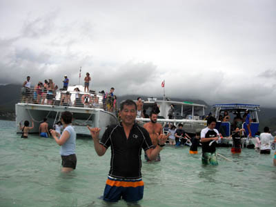 ![]() サンドバーで知られたカネオヘ湾でシュノーケルするために VIPツアーの「キャップテンボブツアー天国の海ツアー」に申し込みました。 有名な「キャップテンブルースのサンドバー天国の海ツアー」ではありませんよ。 前日は、シェラトン・ワイキキホテルのプールでカクテル飲みながら、 JTBの無料のスパムおにぎりとカップ麺を食べながら一日中のんびりしていました。 夕方の散歩ついでに街角に置いてあったフリーぺーを見ながら、 値段も手頃でランチ付きのアクティブツアーを申し込むつもりでした。 カイルア&ラニカイビーチ海のツアーの、 「無人島カヤックツアーランチ付き60ドル」が良さそうでしたが、 現在、ラニカイビーチでのカヤックは、自然保護上中止になっているといわれました。 それで、「天国の海キャップテンボブツアー」に切り替えました。 日本語ガイド付き、ホテル送迎、料金チップ込み、ランチ付きで、1人82ドルした。 妻も僕も日本では、ハンバーガーを食べることは皆無ですが、 どういうわけか、ハワイのツアーで食べるハンバーガーが気に入りました。 「天国の海キャップテンボブツアー」のランチも、 船長さんの焼きたてのハンバーガーが食べられるということです。 翌日のツアーに空きがあったので、申し込みました。 9時15分にツアーバスがホテルに迎えに来るという。 大型バスの席には、日本人のツアー客で半分埋まっていました。 このままカネオヘかと思っていたら、 あと2ヶ所のホテルに迎えに行きました。 外人さんは、平気で遅刻するのですね。 次のホテルでは、5分くらい、最後のホテルでは10分以上も待たされました。 部屋に電話して、それから待ち合わせ場所まで来るんですかね。 遅刻は白人集団と中国人ファミリーでした。 日本人は、真面目ですね。誰も遅刻しませんでしたよ。 年配の中国人は、ツーアーガイドに、後ろの席から大声で話しかけています。 ツアーの説明をする前にですよ。 後ろと前の大声のやりとりは、乗客無視のしらけもいいところ。 ツアーガイドは、日本語をほとんどしゃべれません。 何となく聞いていると、ツアー客の国籍は、 日本人約20人、アメリカ人5人、中国人5人、カナダ人3人、 オーストラリア人とケニア人とインド人が2人ずつの組み合わせでした。 これほど混成国籍のツアーははじめてです。 ワイキキからカネオヘまでバスで約40分。 ガイドは、英語でなにやらしゃべりっぱなし。 冷房の効きすぎたバスの中は寒いし、声がうるさいし、 英語も中国語も理解できない僕は、つまらない。 11時にほぼ満員の大型バスが、カネオヘの駐車場に到着すると ガイドは、「みんな僕についてきて」と、船着き場までいそがせます。 バスの遅れを取りもどすためなのか、 トイレにも、着替えにも行かせてくれません。 船着き場について、 日本人グループと、外人グループに分けられました。 日本人グループには、女性の日本人ガイドがつきました。 船も別々だというので、ホッとしました。 乗船前のツアー説明の間、僕は走ってトイレに行きました。 カタマラン船の中にもトイレはあるのですが、狭くていき苦しい。 乗船すると、日本人女性ガイドの他に、 現地人の若いスタッフ二人と、船長が明るくあいさつしました。 ツアー客の日本人が、せわしなく乗船すると、 すぐにサンドバーに向け出発です。 サンドバーには、10分足らずで到着です。 今にも雨が降りそうな曇り空の中、 三隻のカタマランが同時に出発しました。 日本人以外の船は、船着き場で合流した人たちでいっぱいでした。 ![]() サンドバーに到着すると、 海水は、膝下あたりまでありました。生暖かい海水でした。 満月の時期には完全に海面に出るサンドバーらしいですが、 前回来たときも、膝上あたりまで海水がありました。 サンドバーが3回目の妻は残念がっていました。 シュノーケルの初心者は、サンドバーで練習してくださいといわれ、 シュノーケル片手に下船です。 半分くらいの人がシュノーケルを持って船から下りました。 僕ら夫婦は中級者ですから、当然手ぶらで下船です。 先に船から降りたスタッフが、船の近くでバレボールーのネットを張り出しました。 ![]() サンドバーで特別にすることもないので、 ビーチバレーならぬ、海中バレーをやろうということです。 ボールを打つごとに、ひっくり返るので、見ているぶんには面白いですね。 2人で海水をかき分けブラブラ歩いていると、 たっぷり陽に焼けた女性ガイドが写真を撮ってくれるといいましたので、 僕らも防水カメラを渡し、数枚撮ってもらいました。 恥ずかしながら、久しぶりに手をつないだり、指でハートマークを作ったり楽しかったですよ。 同じ船の若い男女が、デジカメを海中に落としたとかで、大騒ぎ。 防水カメラでないことを後悔していました。 ![]() サンドバーには20分くらいいました。 幸いにも、雲は消え、青空に変わっていました。 サンドバーには小魚