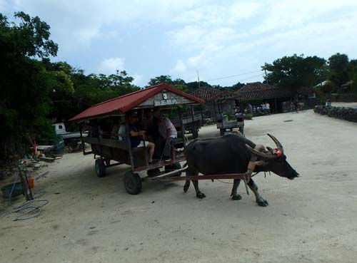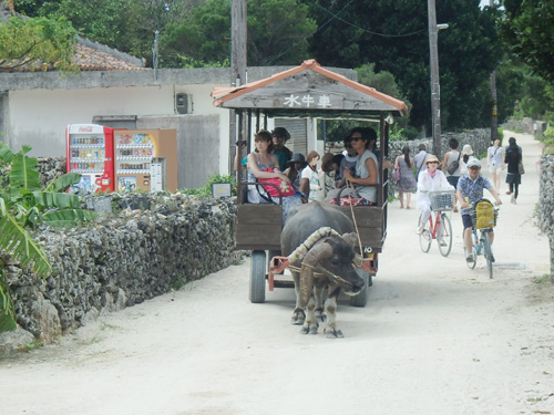 | 石垣島から目の前の竹富島がよく見える。石垣島で海遊びが出来ない日は石垣港離島ターミナルから約10分の竹富島へ。港に停車の送迎バスで集落中心部でガイド付き水牛車に申し込めば白砂の道を三線島唄を聴きながらのんびり30分。竹富島巡りをするならサイクリングと聞いたが夏場には半端ない暑さを感じる観光客には辛い。展望台の「なごみの塔」には人の列。木陰のパーラーのアイスもすぐ溶ける。 | ||