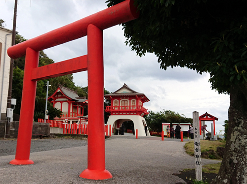 池田湖畔に建っている黄金の鳥居に寄った次の目的地は薩摩半島最南端にある『長崎鼻灯台』と『龍宮神社』。 長崎鼻は薩摩半島の最南端に突き出た岬で浦島太郎が竜宮へ旅立った岬とも言い伝えられ「竜宮鼻」の別名を持ち、乙姫様を祀った龍宮神社は若いカップルに人気があるそうです。 また長崎鼻はその名にふさわしく、春から夏にかけて、海亀が産卵に来るそうです 長崎鼻灯台と龍宮神社に行く手前には駐車場がある。 指宿市営の無料駐車場で16台駐車できるようだ。大型バスもここに停まる。 長崎鼻灯台は龍宮神社の先にあり、駐車場から徒歩5分程度の岬の突端にある。 駐車場のすぐ近くに御朱印帳の記載を取り扱っている土産物屋がある。 御朱印帳を持っている人は”御朱印取り扱い店のにしき屋”に立ち寄ればいい。 長崎鼻灯台や竜宮神社を見学する前に、この土産物店に立ち寄り受付に依頼することになっている。 店の受付に御朱印帳を預けておけば、灯台や神社の見物後に引き取れるので時間の節約になる。代金は後払いだ。 龍宮神社は土産物店からは目の先。 土産物店の先にはこんな展示物があった。 ![]() 長崎鼻灯台に行く前に竜宮神社でお参り。 少し歩くと可愛い竜宮城が見えて来ます。 拝殿が竜宮城みたいでとても可愛い。 ![]() ここで貝殻に願いを書き、壷に入れて奉納すると素敵な出会いがあるといわれている。 この竜宮神社では、願い事は、絵馬でなく絵貝。 大きな貝殻に文字を書くことになっている。 拝殿の賽銭箱周辺は牡蠣殻でいっぱいになっていました。 ![]() この店や竜宮神社の前あたりからさらに下って行くと灯台があり、ハートのオブジェがあった。 観光老夫婦も何となくハートの中をくぐりましたよ。(笑) ![]() 海越しに眺める開聞岳の山容も美しく、天気が良い日は屋久島や硫黄島まで見ることができるらしいがあいにくの曇り空で硫黄島は見えず残念! ![]() 龍宮といえば、浦島太郎。 浦島太郎像を二週回って亀を撫でると心願成就すると言われています。 亀の頭部や背中は撫でる人が多くツルピカ。 男女で右回りと左回りが違うのはなんでかな?出会い頭? ![]() 灯台に行く通路の周辺付近には天然の蘇鉄が多数見られる。 ◇鹿児島県の観光案内より 龍宮神社(りゅうぐうじんじゃ)は,竜宮伝説発祥の地である長崎鼻にある豊玉姫(乙姫様)を祀った神社です。 海の守り神と浦島太郎と乙姫様が出会った縁結びの神様として大切にされています。 薩摩半島最南端の長崎鼻にある、浦島太郎と乙姫様が出会った竜宮伝説発祥の地で、豊玉姫(乙姫)を祀った神社、縁結びや海の神様として大切にされている。 長崎鼻は薩摩半島の最南端に突き出た岬。海越しに眺める開聞岳の山容も美しく、天気が良い日は屋久島や硫黄島まで見ることができます。 竜宮の伝説は、神話では海幸彦と山幸彦の物語として語り継がれています。 海幸彦の釣り針を失くした山幸彦が、それを探し求めて出かけた先が竜宮とされています。山幸彦はのちに豊玉姫と結ばれますが、その子孫が天皇家へと受け継がれていきます。 また、浦島太郎が竜宮へ旅立った岬とも言い伝えられています。 別名「竜宮岬」ともいわれ、豊玉姫(乙姫様)を祀った龍宮神社が鎮座する風光明媚な土地です。 竜宮伝説の残る神社なので、神社全体がそれに模した作りとなっていて珍しい神社です。 |
